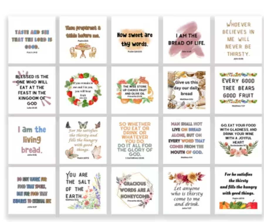 Add a fun and unique touch to your quilting projects with this set of 20 food-themed Bible verse quilt squares. Made from high-quality 4.3oz cotton fabric, each 5” square has a minimum of half an inch of which space between the print and the edge of the fabric. The Bible verses included in this set are: 1. Psalm 34:8 2. Psalm 23:5 3. Psalm 119:103 4. John 6:35a 5. John 6:35b 6. Luke 14:15 7. John 15:5 8. Proverbs 21:20 9. Matthew 6:11 10. Matthew 7:17 11. John 6:51 12. Psalm 107:9 13. 1 Corinthians 10:31 14. Matthew 4:4 15. Ecclesiastes 9:7 16. John 6:27 17. Matthew 5:13 18. Proverbs 16:24 19. John 7:37 20. Psalm 107:9