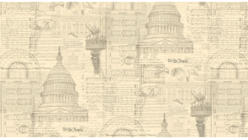 3 Sisters Favorites - Collages - Patriotic by Moda Fabrics celebrates the enduring spirit of the United States with classic American motifs from history. This beige fabric features a vintage collage of writing, music, architecture, and historical buildings, along with flowers native to the country and American flags