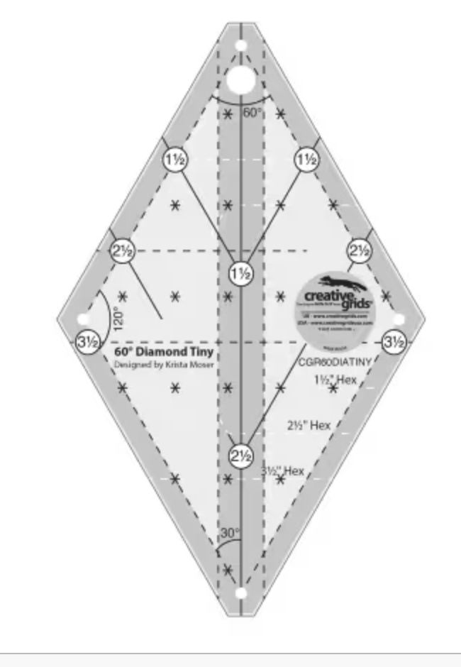 Use this 60 Degree Tiny Diamond Ruler designed by Krista Moser for Creative Grids® to cut diamonds, triangles, hexagons, parallelograms, trapezoids, and 120 degree side-setting triangles up to 3-1/2in. · Made in the USA with high quality acrylic and precision measurements ensuring accuracy for your quilting, sewing, patchwork, and crafting projects. · Creative Grids® exclusive non-slip grip allows you to easily slide the ruler over the fabric until positioned correctly. Then, when slight pressure is applied, the grip holds the ruler in place, eliminating slipping while you cut. · Easy to read black and white markings. · Maximize your fabrics by cutting shapes from strips. · Strip sets make interesting design possibilities when cut with this ruler. · Comes with fully illustrated step by step instructions. · Scan the QR Code printed on the instructions to view a how-to video of these features and to see the patterns that can be made with this ruler. Total Size: 6-1/2in x 4in Creative Grids® Rulers are made in the USA and sold through independent quilt shops as well as select online retailers.