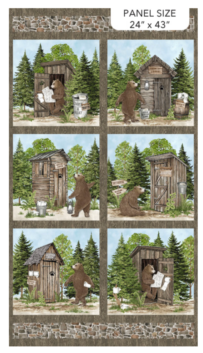 Here are some Northcott Bear Necessities fabric options — a playful quilting cotton collection designed by Deborah Edwards featuring bears, forest motifs (pinecones, trees, wood, clouds) and humorous outdoorsy prints (including bears with toilet paper and outhouses) — perfect for quilts, panels, crafts, and other sewing projects.
