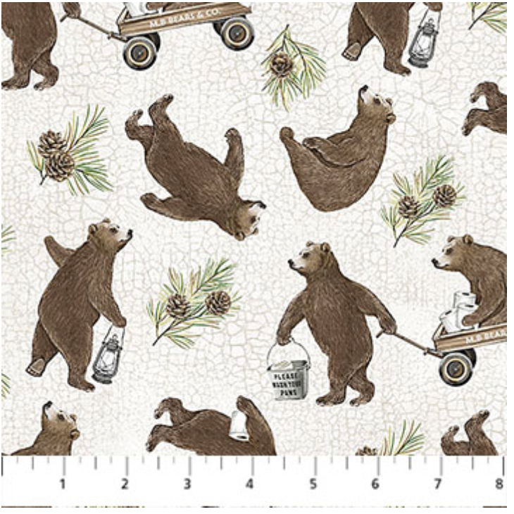 Here are some Northcott Bear Necessities fabric options — a playful quilting cotton collection designed by Deborah Edwards featuring bears, forest motifs (pinecones, trees, wood, clouds) and humorous outdoorsy prints (including bears with toilet paper and outhouses) — perfect for quilts, panels, crafts, and other sewing projects.
