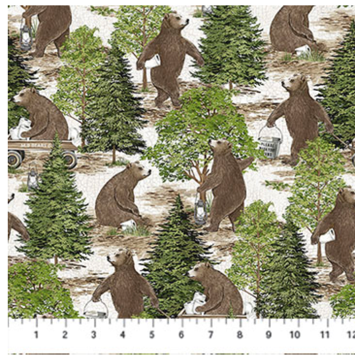 Here are some Northcott Bear Necessities fabric options — a playful quilting cotton collection designed by Deborah Edwards featuring bears, forest motifs (pinecones, trees, wood, clouds) and humorous outdoorsy prints (including bears with toilet paper and outhouses) — perfect for quilts, panels, crafts, and other sewing projects.
