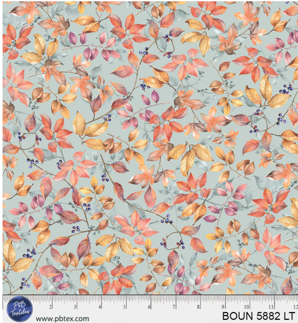 Bountiful by Sandy Clough from P&B Textiles. Classic autumn images with a refreshed color palette of orange, teal, gold, ecru and blue.