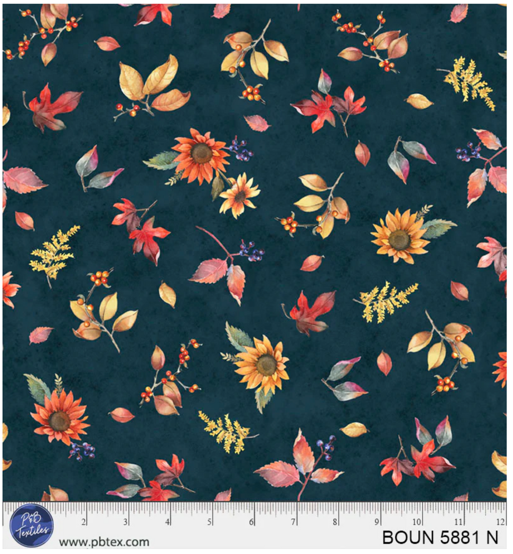 Bountiful by Sandy Clough from P&B Textiles. Classic autumn images with a refreshed color palette of orange, teal, gold, ecru and blue.