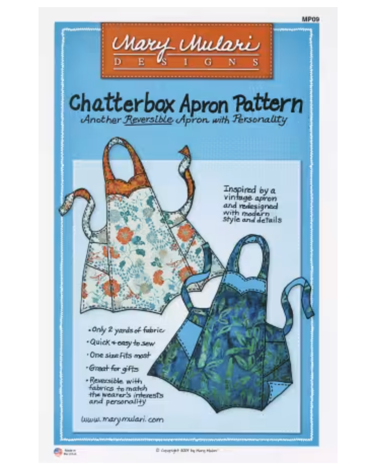 This popular apron features a sweetheart neckline and an umbrella hemline. Side panels each have a pocket. Neckband closes with hook and loop tape. Two 1 yd fabrics required and/or use coordinates for the neckline yokes. For a super bridal shower gift, make this apron and add a towel with a strip of apron fabric.