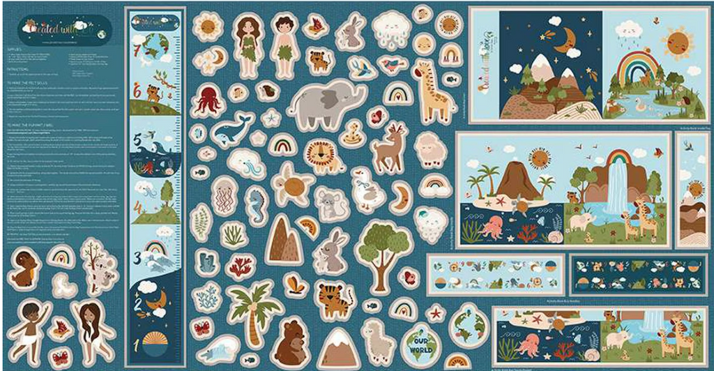 This felt panel features elements from the creation of the earth and pieces to make a tote bag. Join Jennifer for the Created with Love Felt Panel Sew Along beginning May 7, 2025, at www.sewastory.com. Panel size is 36" x 69". Each felt panel comes individually packaged.