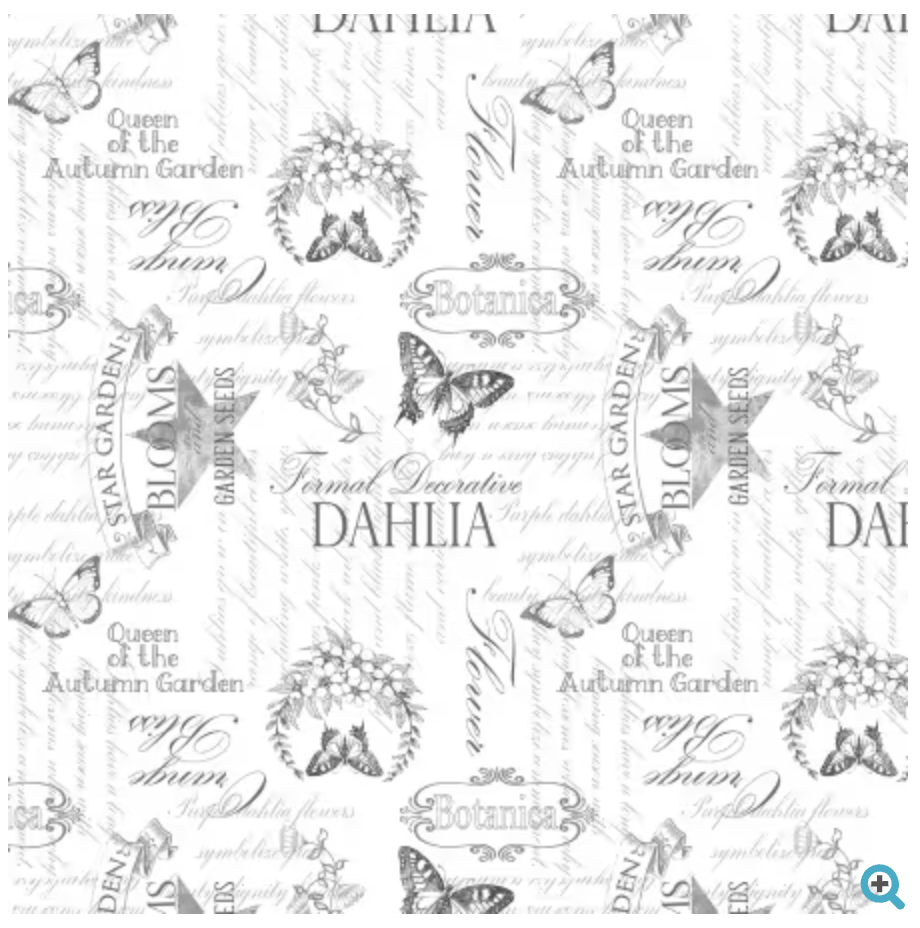 This exquisite fabric features a sophisticated monochrome design with intricate illustrations of butterflies, flowers, and elegant script, evoking a sense of timeless botanical beauty. The pattern includes phrases like "Queen of the Garden," "Botanica," and "Formal Decorative," set against a backdrop of delicate floral elements, making it perfect for creating refined home decor or fashion items that blend classic charm with modern aesthetics.