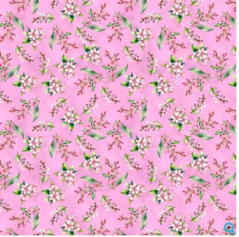 This vibrant fabric features a delicate small floral pattern with a mix of white, pink, and red blossoms accompanied by green leaves, all set against a soft pink background. The design captures the essence of a blooming garden, providing a fresh and lively aesthetic suitable for a variety of sewing projects, from quilting to apparel. The fabric's texture and quality are enhanced by its 100% cotton composition, ensuring comfort and durability.