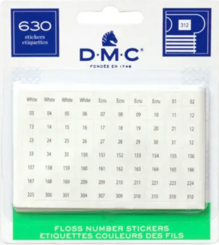 A set of small pre-printed, self-stick labels that can be adhered to DMC Cardboard and Plastic Bobbins to identify DMC Embroidery Floss colors.
