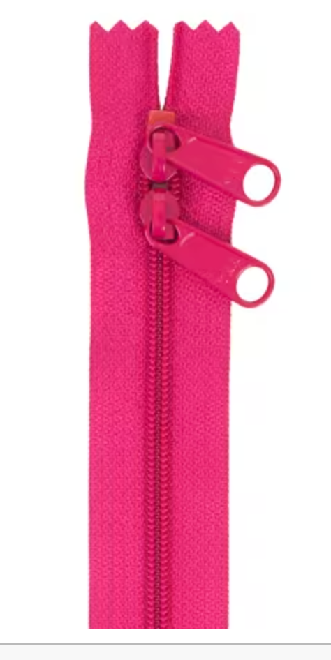 30in Double Slide Handbag Zipper is perfect for purses, totes and bags. The 4.5 nylon coil is strong and durable zip after zip and the wide zipper tape make for easy installation. Color: Pink Length: 30in Tape Content: Nylon