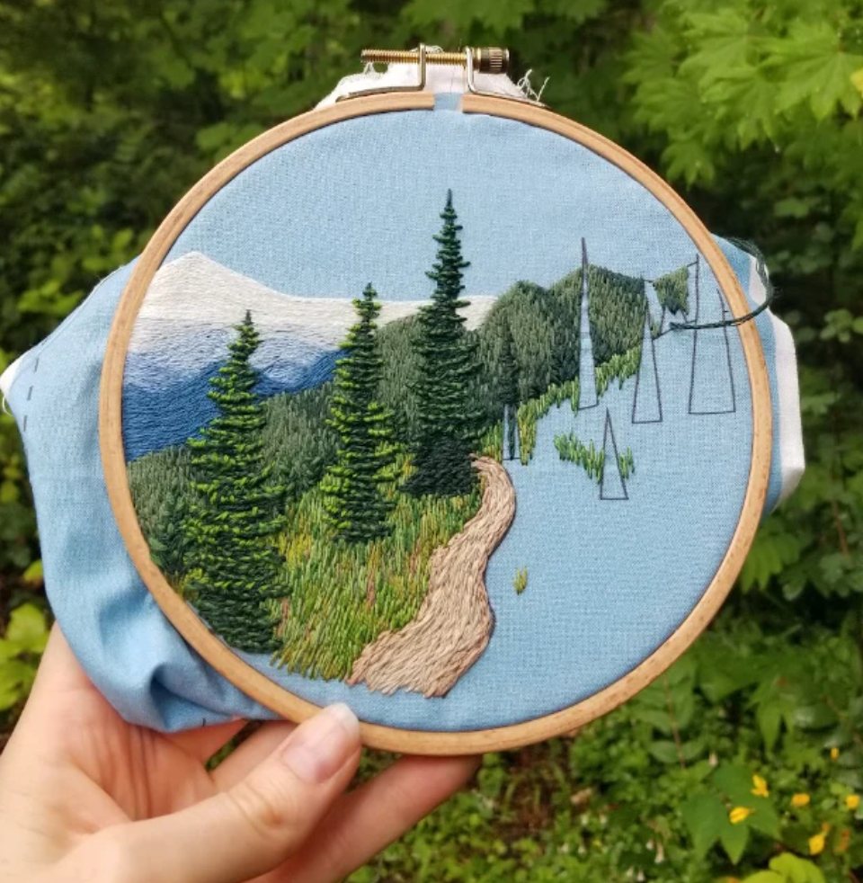 This gorgeous landscape embroidery pattern is a fun, challenging project to get lost in. It features dynamic textures, surprising stitches, and rich colors. There is an online video tutorial to help guide you, but I would not suggest this design for beginners. This alpine meadow scene is recreated from photos taken during our hike of Mount Townsend in Washington State's Olympic Peninsula.
