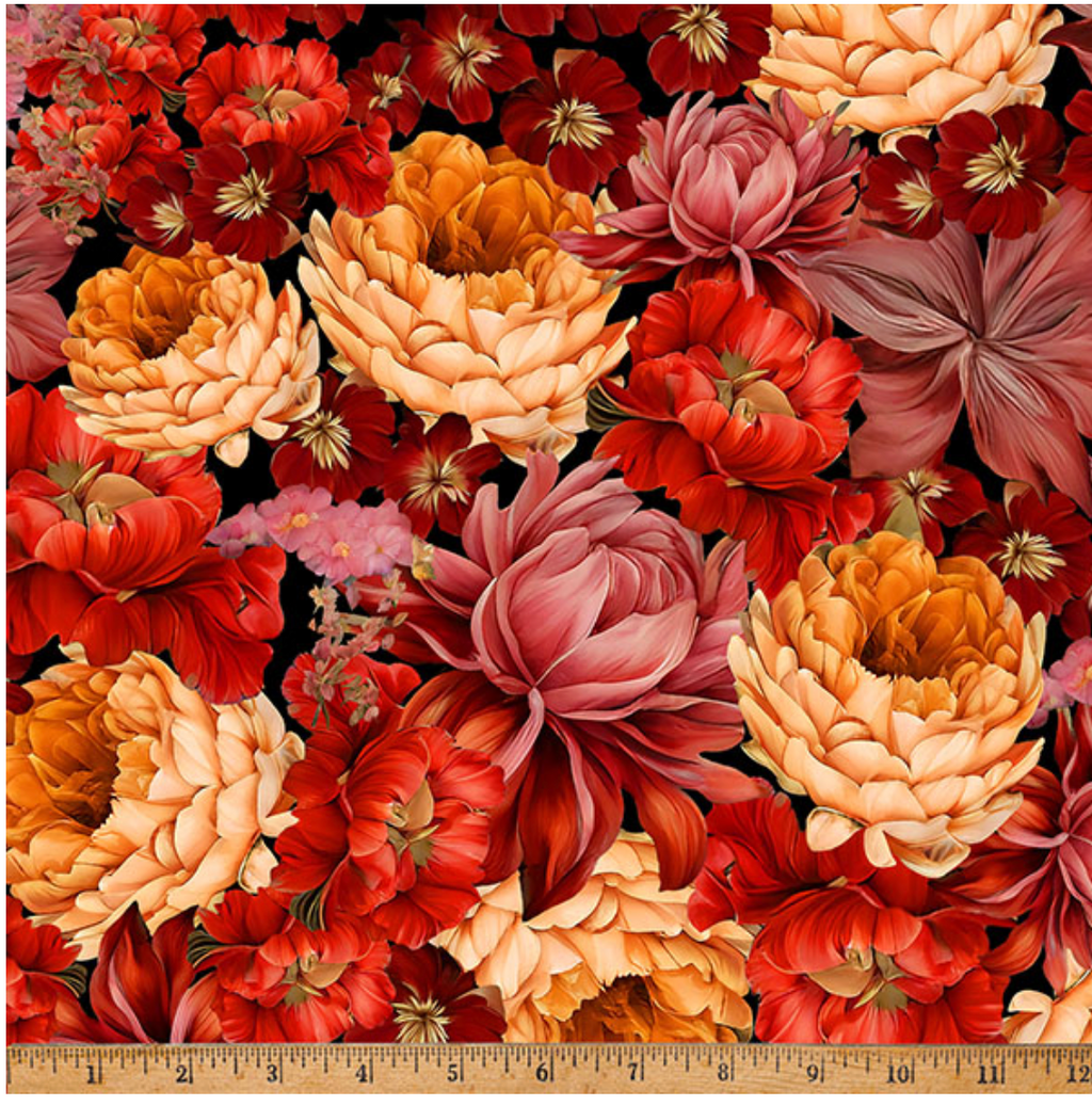 Island Bouquet by Hoffman. Red, peach, rose, and wine flowers on black.