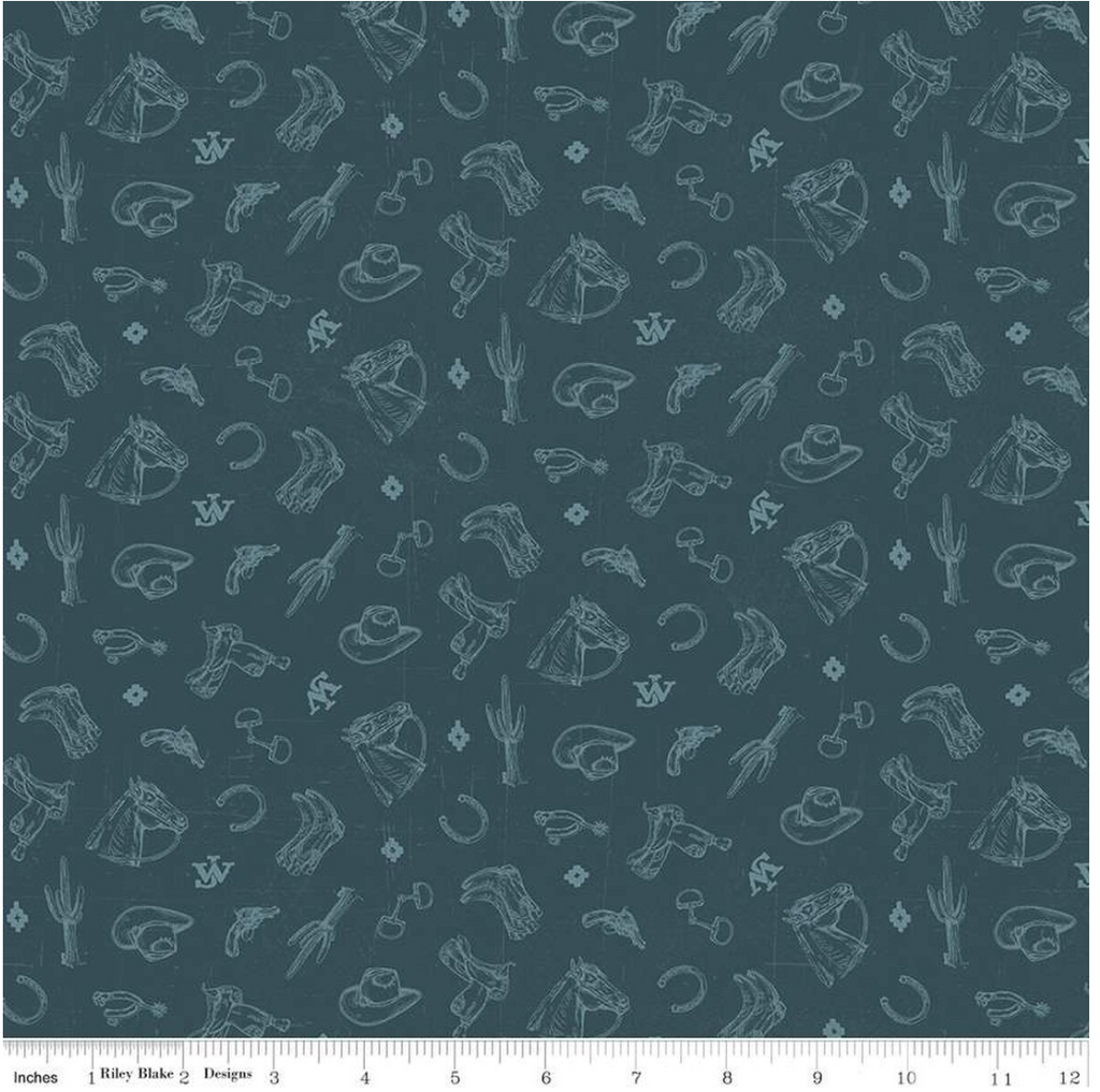 The John Wayne American West collection for Riley Blake Designs is great for quilting, apparel and home decor. This print features western-themed icons such horses, spurs, horseshoes, saddles, and more. Official licensed product.