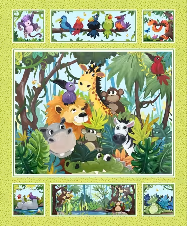 This playful panel is packed with bright colors and sweet jungle animals, perfect for baby quilts, toddler throws, wall hangings, or quick panel projects. The coordinating fabrics shown make it easy to build borders and finish a full quilt without overthinking it.