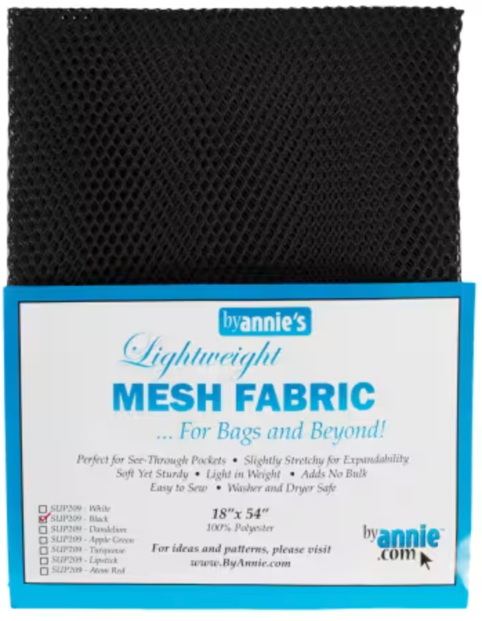 Lightweight and a bit stretchy, this mesh is fabulous! Perfect for pockets on bags or anywhere you want to be able to see what you are storing, the mesh also works great in various garment applications and utility needs. To help you sew, the mesh is specially coated to be less slippery and easy to work with, while still being soft and pliable.