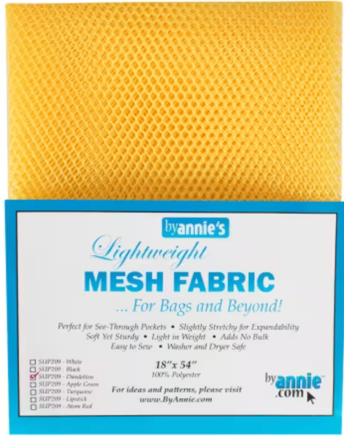 Lightweight and a bit stretchy, this mesh is fabulous! Perfect for pockets on bags or anywhere you want to be able to see what you are storing, the mesh also works great in various garment applications and utility needs. To help you sew, the mesh is specially coated to be less slippery and easy to work with, while still being soft and pliable.