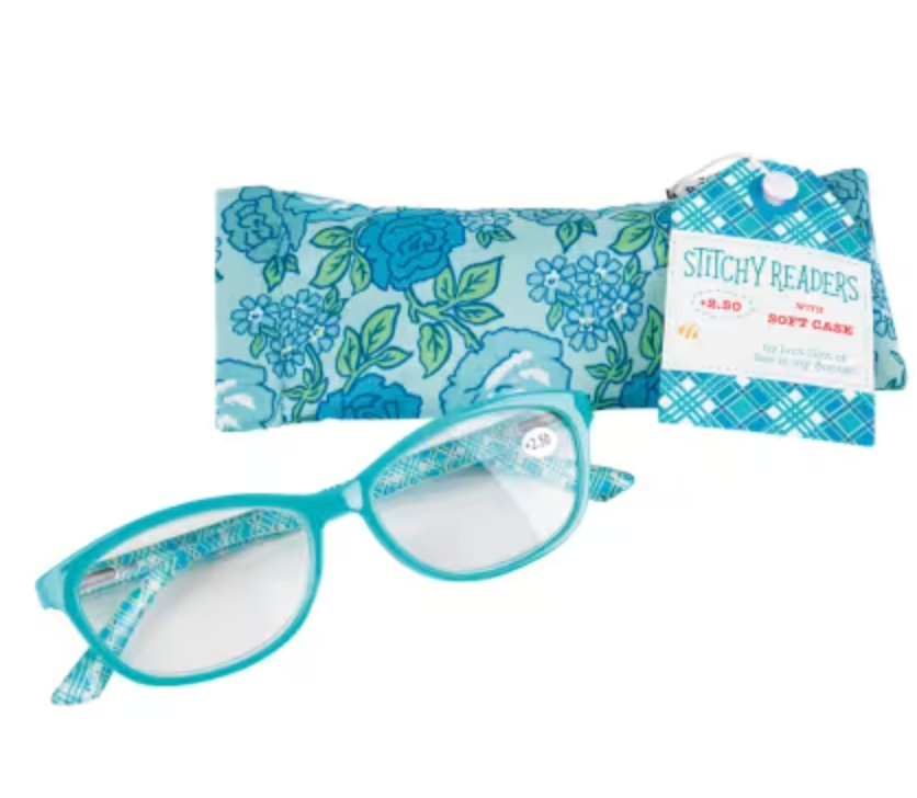 The Reader Glasses by Lori Holt of Bee in my Bonnet come in fun colors and include a soft case. This pair of glasses is +2.50 strength. Use: Reading Glasses Size: +2.50 Strength Included: One Pair of Glasses