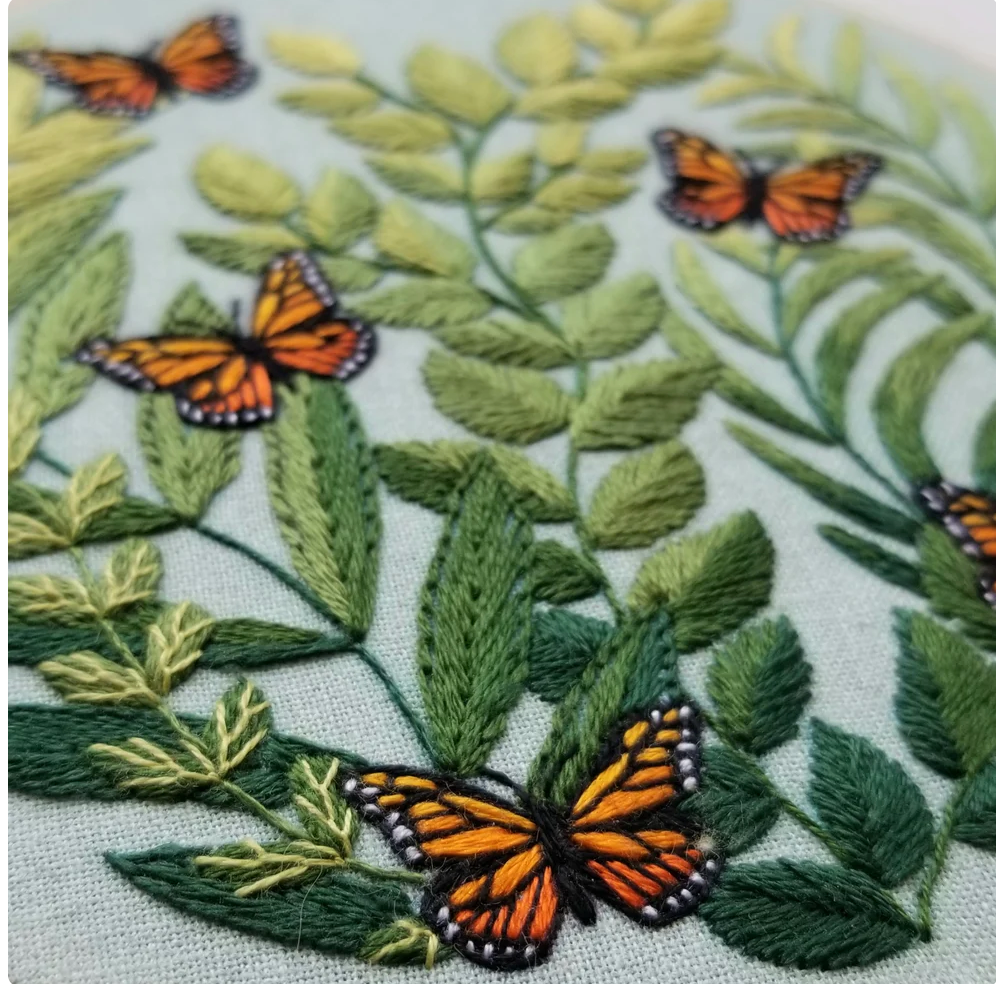 Butterflies and growing plants weave together in the shape of a heart in this inspiring embroidery design. This craft project is perfect for the ambitious beginner stitcher who is ready to expand their skills.