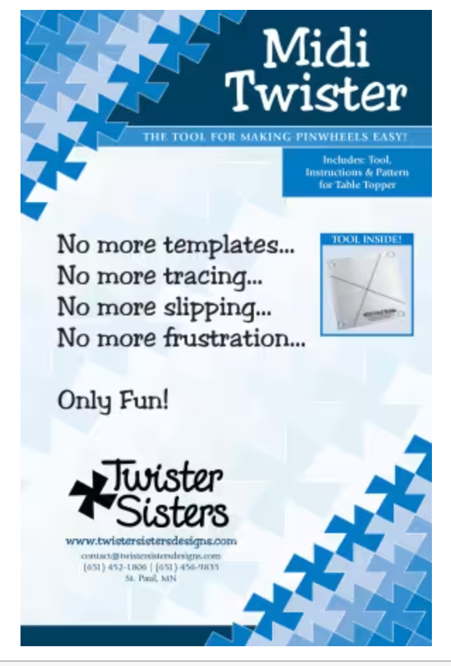 This great in between size makes pinwheels that are larger than those made with the Lil’ Twister and smaller than those made with the Twister. Perfect for throw/twin size quilts and other projects. Product includes tool, instructions for use, and quilt pattern for 23in x 32in topper.