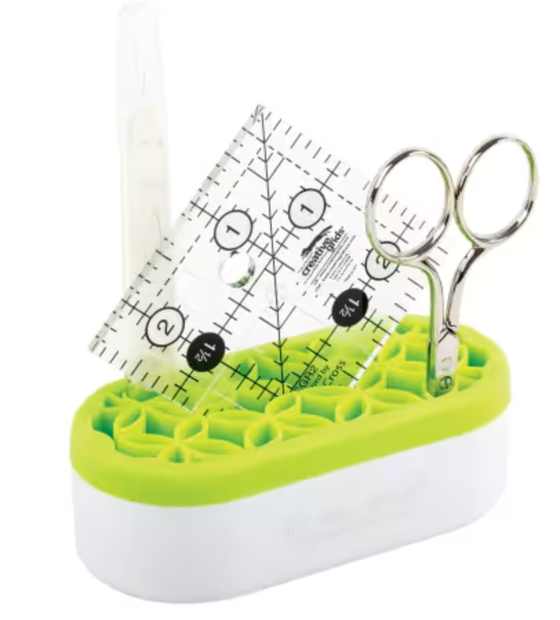 Stash ‘n Store organizer now comes in a sweet new size! The Mini Stash ‘n Store is the perfect organizer for even the tightest and smallest of spaces. With multiple pockets and a center divider, easily stow away sewing notions, marking tools and even small scissors and rulers. It’s the perfect pocket-sized travel companion for stitching on the go! The silicone pockets are smooth and offer a sturdy grip and it is also simple to clean. Available in various colors, collect them all for your sewing room, vanity and home office!