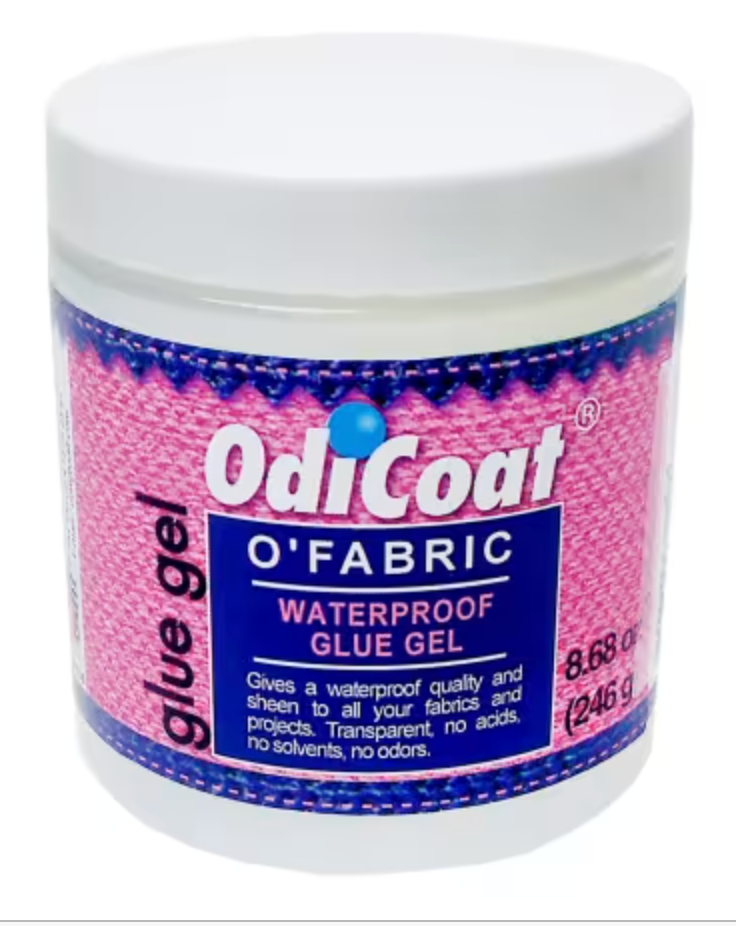 This liquid gel provides a waterproof quality and sheen to any fabric or paper. Transparent and odorless, acid-free and solvent-free. Odicoat gives an oilcloth waxed appearance to fabric while protecting it. Once applied the fabric can be sewn, cut, hand or machine washed. Dries in 30 minutes to the touch, and will be completely dry in 12 hours. Can also be sued as a glue. It will adhere fabric to any surface. Contains 8.68oz.