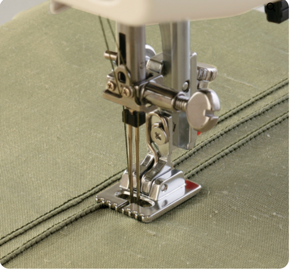 The pintucking foot is used with a 2mm twin needle to create multiple rows of pintucks. The grooves on the underside of the foot make it easy to stitch several rows parallel and evenly spaced from each other