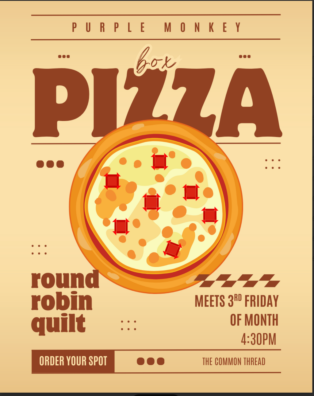 Purple Monkey Pizza Box Club is a round robin style quilt project that runs for the full year. Each month, members create a Churn Dash block with a crazy quilt center, using a designated color scheme. Blocks rotate between members, and by the end of the year, everyone receives a completely unique quilt made by the group.
