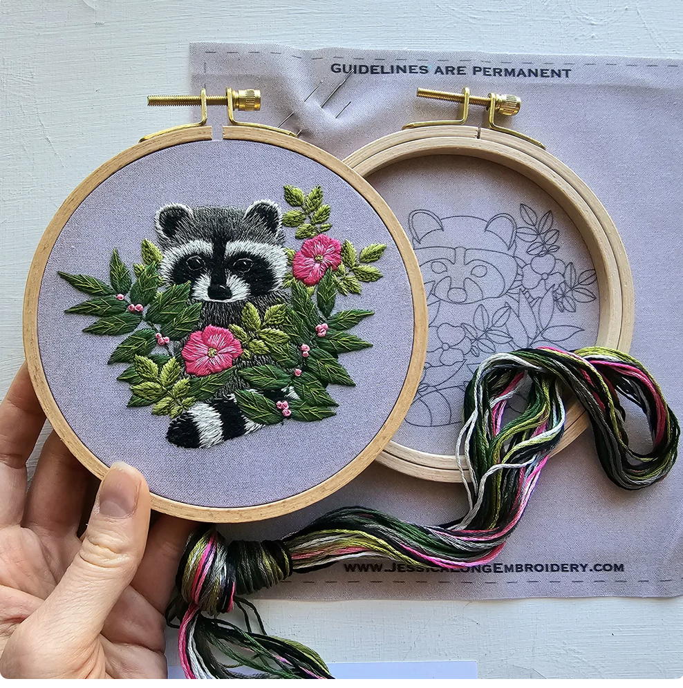 This sweet raccoon project is a joy to stitch, perfect for wildlife loving crafters! The accompanying online video tutorial will help to teach and encourage any stitchers new to thread painting, the technique used to create the realistic, fluffy fur. Your kit includes: Grey fabric, permanently printed with the template A 5 inch wood embroidery hoop Hand embroidery needles 9 colors of DMC cotton embroidery floss Color printed embroidery pattern A copy of the Beginner Guide A link to the online video tutorial