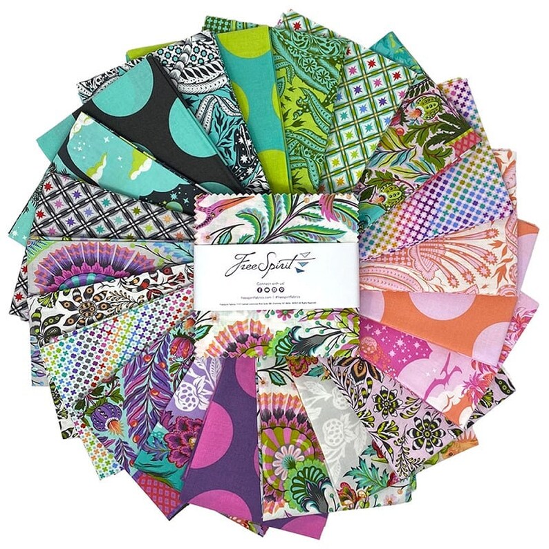 Dinos aren't just for kids anymore! According to designer Tula Pink Roar! is a whimsical take on fancy dinosaurs. You'll find t-rexes and triceratops accompanied by dots and foliage in a wide array of bright colors. This collection is sure to satisfy fantasy lovers.