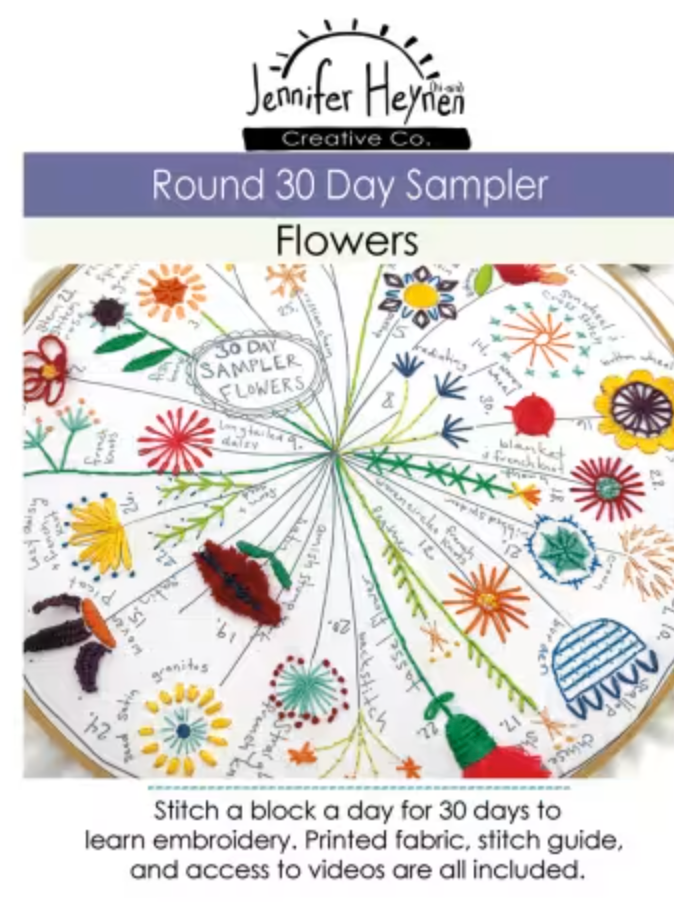 Stitch a flower a day in the 30 day sampler kit. Kit includes printed fabric, access to a class blog with videos of all of the stitches as well illustrations. There is a full color stitch guide included in the kit as well. Fabric is 16" x 16" and the printed area is a 12" diameter round circle. It can be displayed in a 12" hoop when finished.