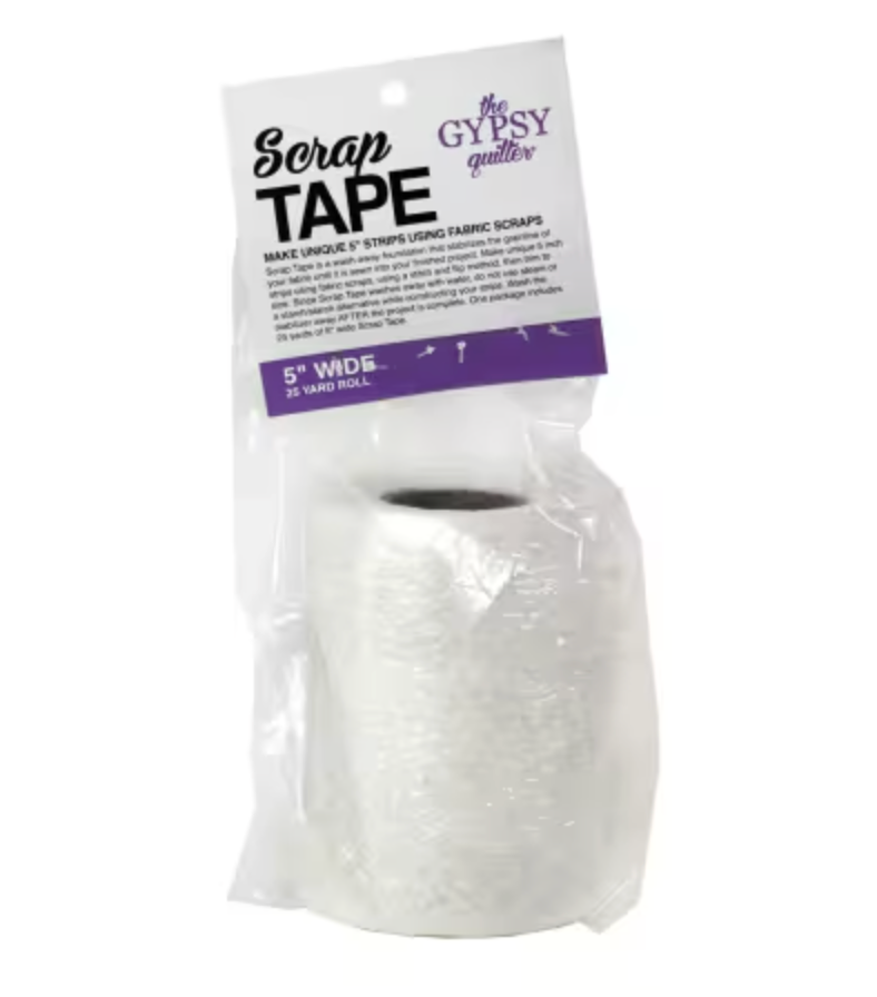 Scrap Tape is a wash away foundation that stabilizes the grain line of your fabric until it is sewn into your finished project. Make unique 5- inch strips using fabric scraps, using a stitch and flip method, then trim to size. Since Scrap Tape washes away with water, do not use steam or a starch/starch alternative while constructing your strips. Wash the stabilizer away AFTER the project is complete. One package includes 25 yards of 5in wide Scrap Tape.