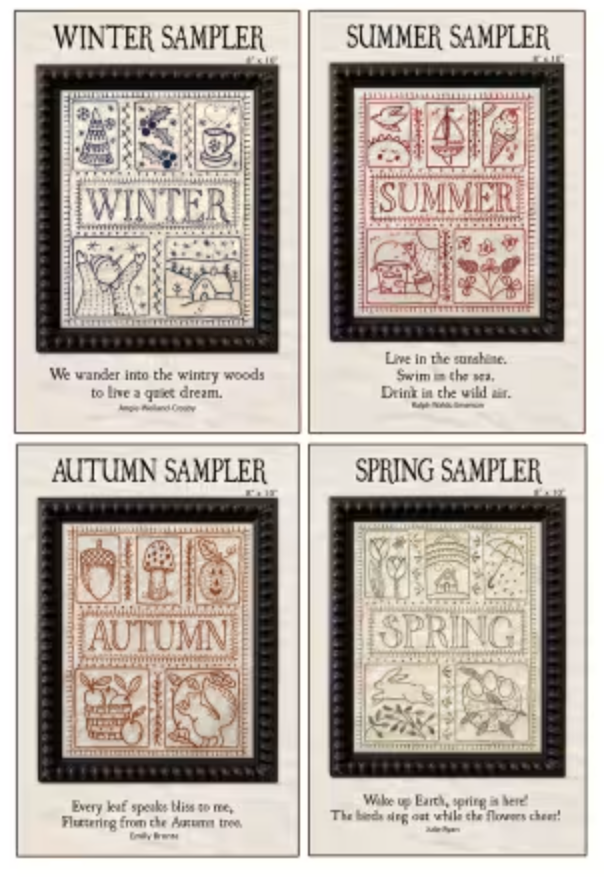A set of all four of the seasonal embroidery patterns - Winter Sampler, Summer Sampler, Spring Sampler, and Autumn Sampler. These patterns are great for teaching hand embroidery. Each pattern used a variety of simple stitches. There is also a helpful video tutorial available on YouTube. The patterns include a QR code which links to the YouTube tutorial.