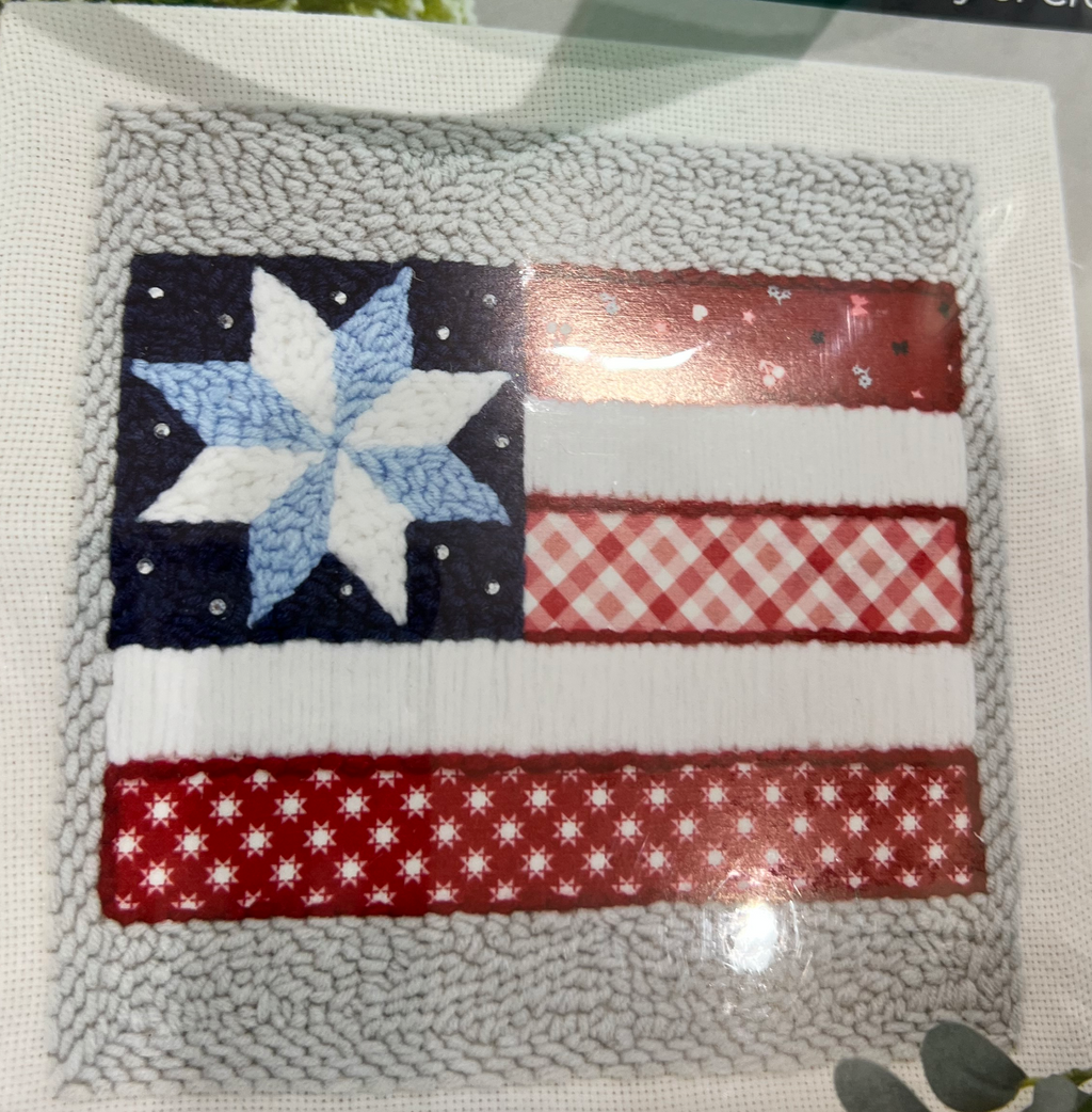 It’s the Stars & Stripes Forever! Kimberbell’s patriotic Punch Needle Plus kit includes all the supplies you need to completely finish your project, including the tool, preprinted monks cloth, yarn, hoop, applique fabric, rhinestones, and detailed video tutorials. Punch a traditional quilting star in the upper left corner, add adorable applique stripes, and finish with punched satin stitches!