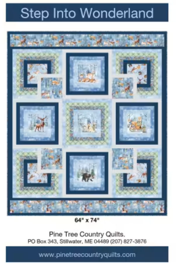 64" x 74". Simple Courthouse Steps blocks add frames to panel squares that are set with modified blocks to make the squares in squares in squares design. Fabrics from the Woodland Wonderland collection from Benartex. Skill Level: