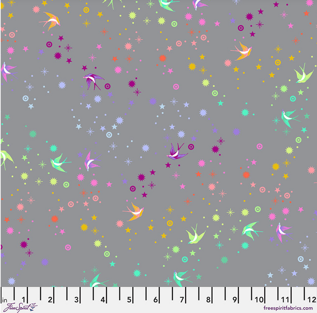 From Tula Pink:Graywork is a follow up to my black and white collection titled “Linework” from 2020. This is a neutral collection designed in various shades of gray to fill the spaces between the rainbows. Graywork began as a collection of all gray prints and slowly blossomed to include touches of color to spice things up. I find it impossible to leave something completely void of color. For the main prints of the collection I focused on animals that live their lives in shades of gray; Wolves, Bears, Snow Leopards, Puffins and Sea Lions. These eight prints are big and illustrative packed with details deigned for fussy cutting as the stars of the show. The coordinating prints are variations on existing True Colors prints with some new pieces for texture. These might be the back up dancers to the hero prints but they are essential to connecting the prints and filling in the gradient or grays. The multi colored Stripe is back on both a soft gray and a charcoal gray ground and the Poms have been added to the party in a new rainbow version to coordinate with the stripes! You will find new medium and dark shades of Fairy Dust sprinkled in amongst the classic tonal grays for backgrounds and blending. The last thing that I felt this collection really needed was something that could act like a solid which came in the form of new Tiny Dots and a brand new print of tonal repeating triangles called “Kinda Shady”. While packed with artistic details this collection is designed, first and foremost to be useful. Leave it be or add in my other collections for maximum versatility.