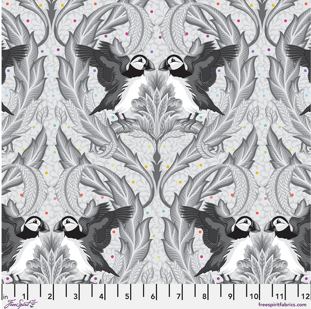 From Tula Pink:Graywork is a follow up to my black and white collection titled “Linework” from 2020. This is a neutral collection designed in various shades of gray to fill the spaces between the rainbows. Graywork began as a collection of all gray prints and slowly blossomed to include touches of color to spice things up. I find it impossible to leave something completely void of color. For the main prints of the collection I focused on animals that live their lives in shades of gray; Wolves, Bears, Snow Leopards, Puffins and Sea Lions. These eight prints are big and illustrative packed with details deigned for fussy cutting as the stars of the show. The coordinating prints are variations on existing True Colors prints with some new pieces for texture. These might be the back up dancers to the hero prints but they are essential to connecting the prints and filling in the gradient or grays. The multi colored Stripe is back on both a soft gray and a charcoal gray ground and the Poms have been added to the party in a new rainbow version to coordinate with the stripes! You will find new medium and dark shades of Fairy Dust sprinkled in amongst the classic tonal grays for backgrounds and blending. The last thing that I felt this collection really needed was something that could act like a solid which came in the form of new Tiny Dots and a brand new print of tonal repeating triangles called “Kinda Shady”. While packed with artistic details this collection is designed, first and foremost to be useful. Leave it be or add in my other collections for maximum versatility.
