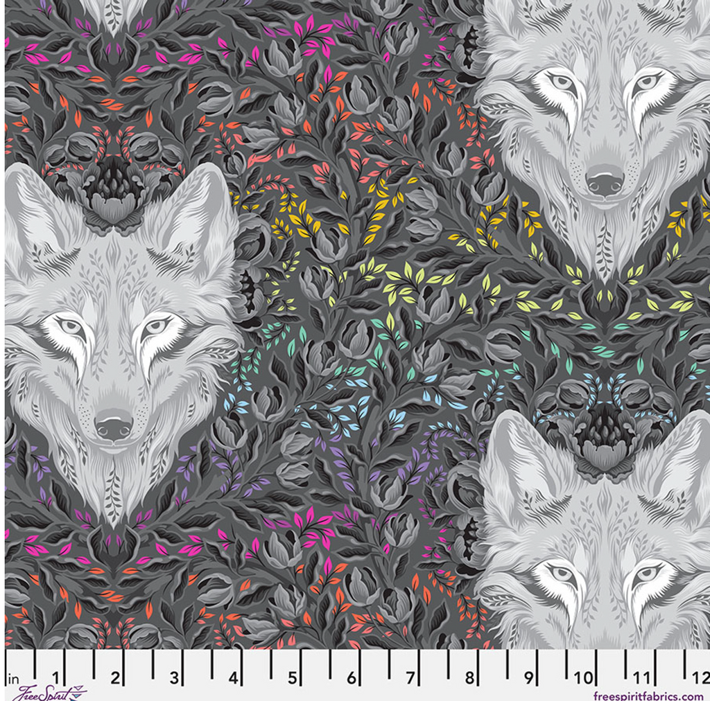 From Tula Pink:Graywork is a follow up to my black and white collection titled “Linework” from 2020. This is a neutral collection designed in various shades of gray to fill the spaces between the rainbows. Graywork began as a collection of all gray prints and slowly blossomed to include touches of color to spice things up. I find it impossible to leave something completely void of color. For the main prints of the collection I focused on animals that live their lives in shades of gray; Wolves, Bears, Snow Leopards, Puffins and Sea Lions. These eight prints are big and illustrative packed with details deigned for fussy cutting as the stars of the show. The coordinating prints are variations on existing True Colors prints with some new pieces for texture. These might be the back up dancers to the hero prints but they are essential to connecting the prints and filling in the gradient or grays. The multi colored Stripe is back on both a soft gray and a charcoal gray ground and the Poms have been added to the party in a new rainbow version to coordinate with the stripes! You will find new medium and dark shades of Fairy Dust sprinkled in amongst the classic tonal grays for backgrounds and blending. The last thing that I felt this collection really needed was something that could act like a solid which came in the form of new Tiny Dots and a brand new print of tonal repeating triangles called “Kinda Shady”. While packed with artistic details this collection is designed, first and foremost to be useful. Leave it be or add in my other collections for maximum versatility.