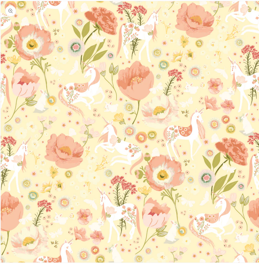 Unicorn Dreams will have your head spinning with its whimsical beauty and artistry. There are unicorns, butterflies, bunnies, birds, bugs dancing among the gorgeous flowers. The large poppies are light and airy. All the patterns are dainty with beautiful soft greens, pale peaches and buttery yellows.