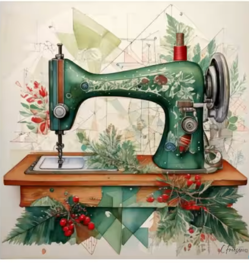 Vintage Holly Machine" is one of the designs in the Vintage Holiday Sewing Collection of greeting cards. The artwork features a green antique sewing machine decorated for the holidays in Quiltberry Farm's signature quiltscape cubist style. This card is a square 6x6 inch art card with blank interior, printed on quality 100 lb cover stock. Matching envelopes are included.