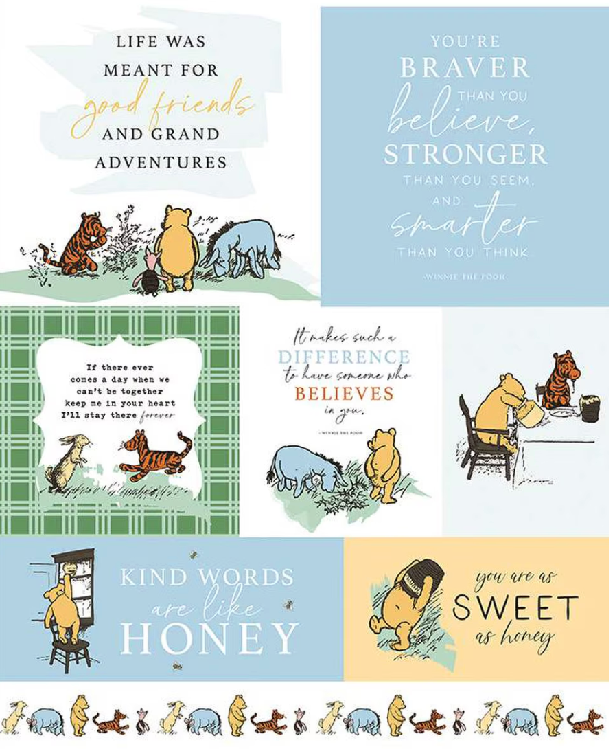 Winnie the Pooh by Echo Park Paper Co. for Riley Blake Designs is great for quilting, apparel and home decor. This panel features a patchwork of scenes and text from Winnie the Pooh. Panel size is 35 1/2" x 43".