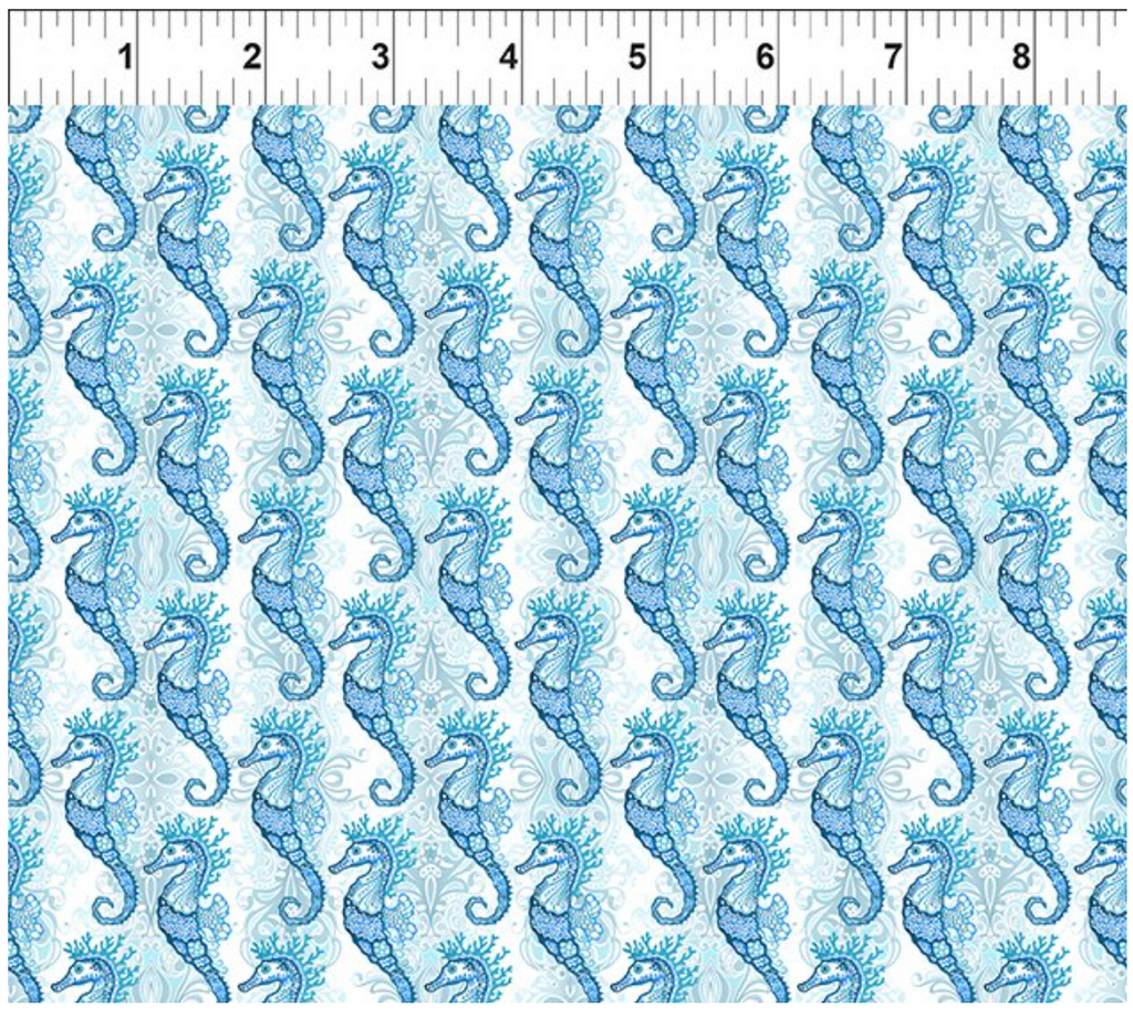 Wonders of the Ocean by Jason Yenter for In The Beginning Fabrics features fish, coral, reef, waves, jelly fish, leaves, water, turtles, waves, shells, sand dollars, and swirls in aquatic shades of cream, blue, navy, teal, green, aqua, grey, white, and green.