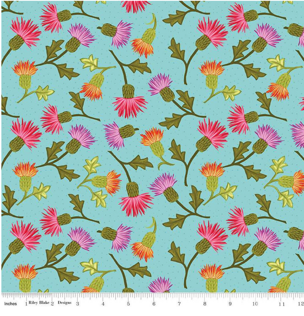 Zinnias by Lila Tueller for Riley Blake Designs is great for quilting, apparel and home decor. This digitally-printed fabric features sprigs of thistles on a dotted background.