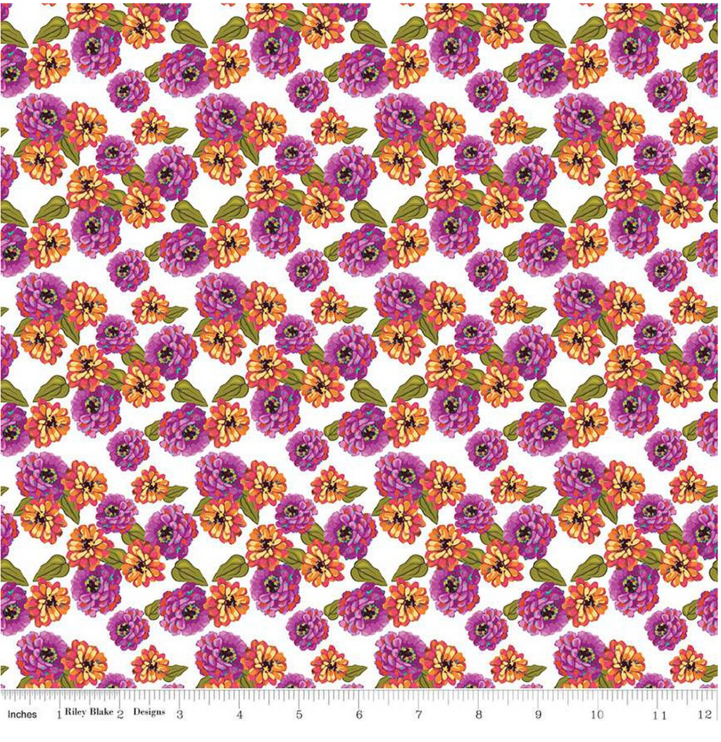 Zinnias by Lila Tueller for Riley Blake Designs is great for quilting, apparel and home decor. This print features small clusters of zinnias.